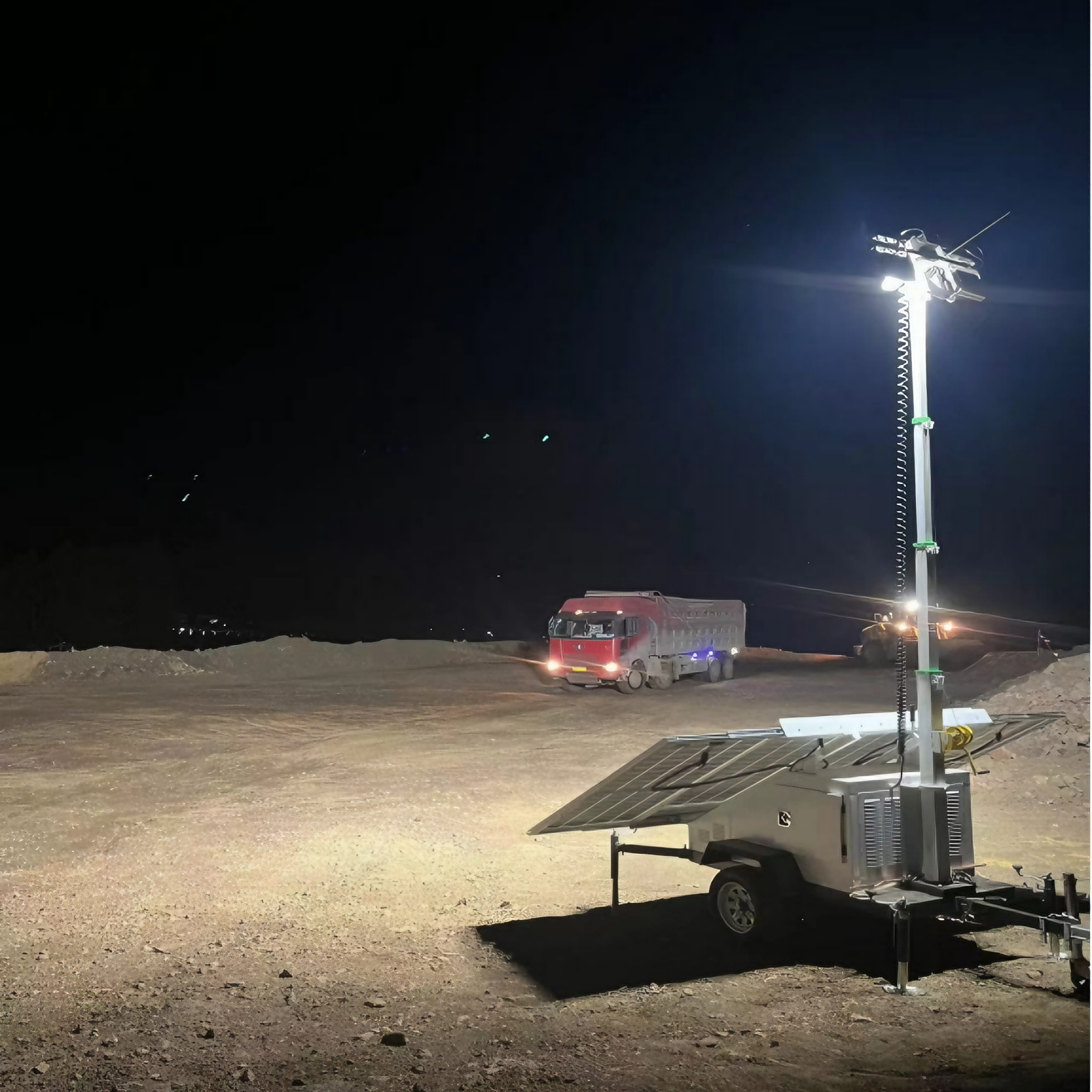 本设备深度融合光伏清洁能源技术与高机动拖车行走底盘,专为无公共电网覆盖、需大面积临时夜间照明的偏远野外矿区场景定制打造。整机具备光伏供电续航扎实、应急兜底供电强劲、全周期运维简易、设备故障率极低、场地转场机动灵活等核心优势,全方位贴合露天矿山崎岖路况、复杂多变的野外昼夜作业需求。