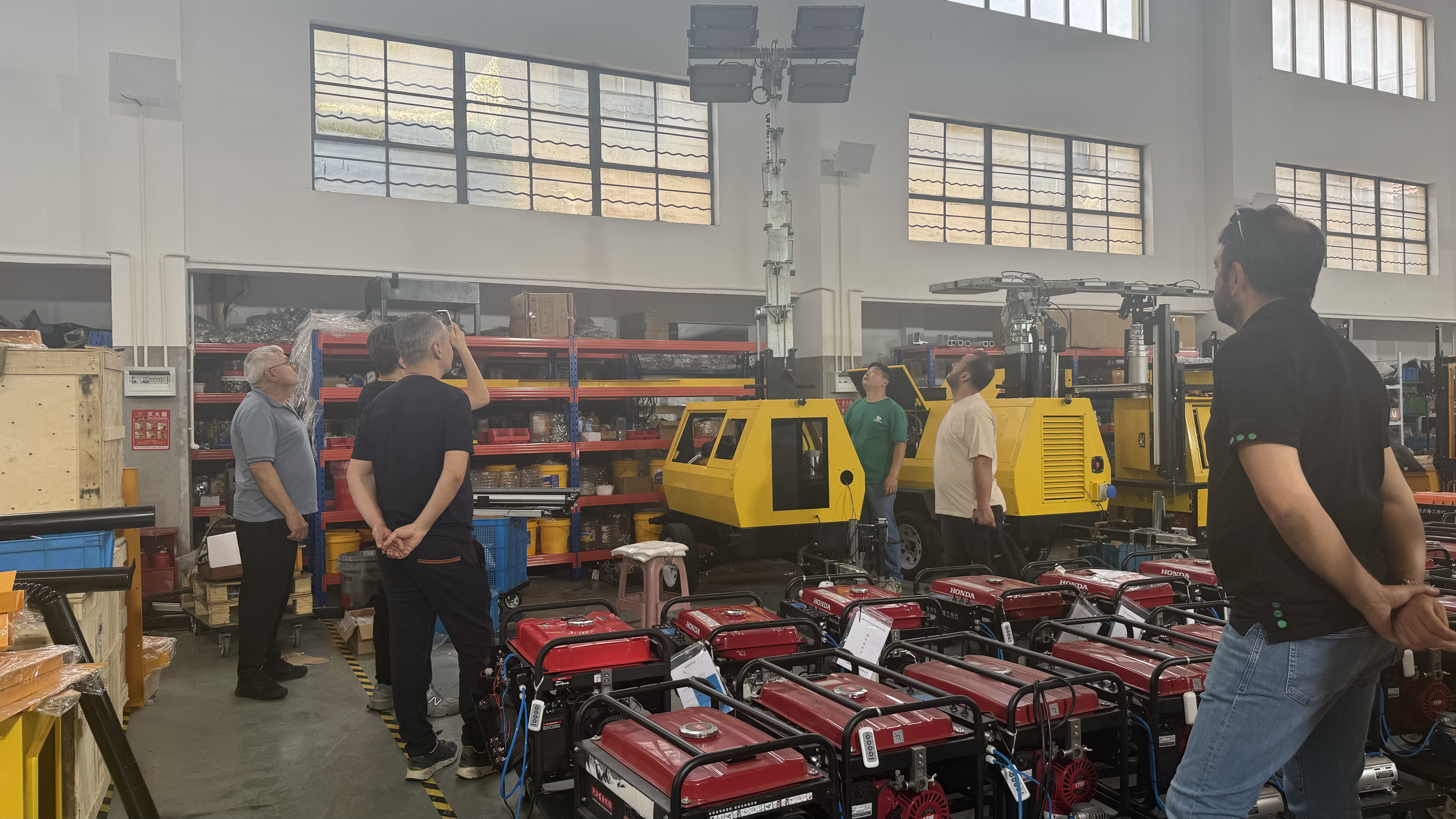 考察团先后深入生产车间、成品装配区域、仓储备货现场,近距离查看移动照明灯塔、移动式照明车、配套发电机组等核心产品的生产工序、工艺细节与成品实测效果。现场工作人员细致讲解设备结构设计、出厂检测标准、产能交付周期与全周期售后配套服务,全方位展现源头工厂规范化生产管理、严苛品质管控体系与成熟外贸供货能力。